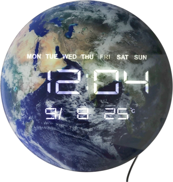 Stijlvolle wandklok in de vorm van de aarde met een fris, opvallend design en uitstekende leesbaarheid. Het geïntegreerde LED-display toont niet alleen de tijd in 12/24-uursformaat, maar ook de datum, de dag van de week en de kamertemperatuur. Betrouwbare netvoeding zorgt voor continu gebruik en de back-upbatterij CR2032 behoudt de instellingen bij stroomuitval.