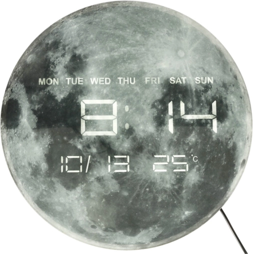 Stijlvolle klok met een realistisch maanthema die de blikvanger wordt in een modern interieur. Het heldere witte LED-display is overdag en ’s nachts goed leesbaar en toont alles wat belangrijk is in één oogopslag.