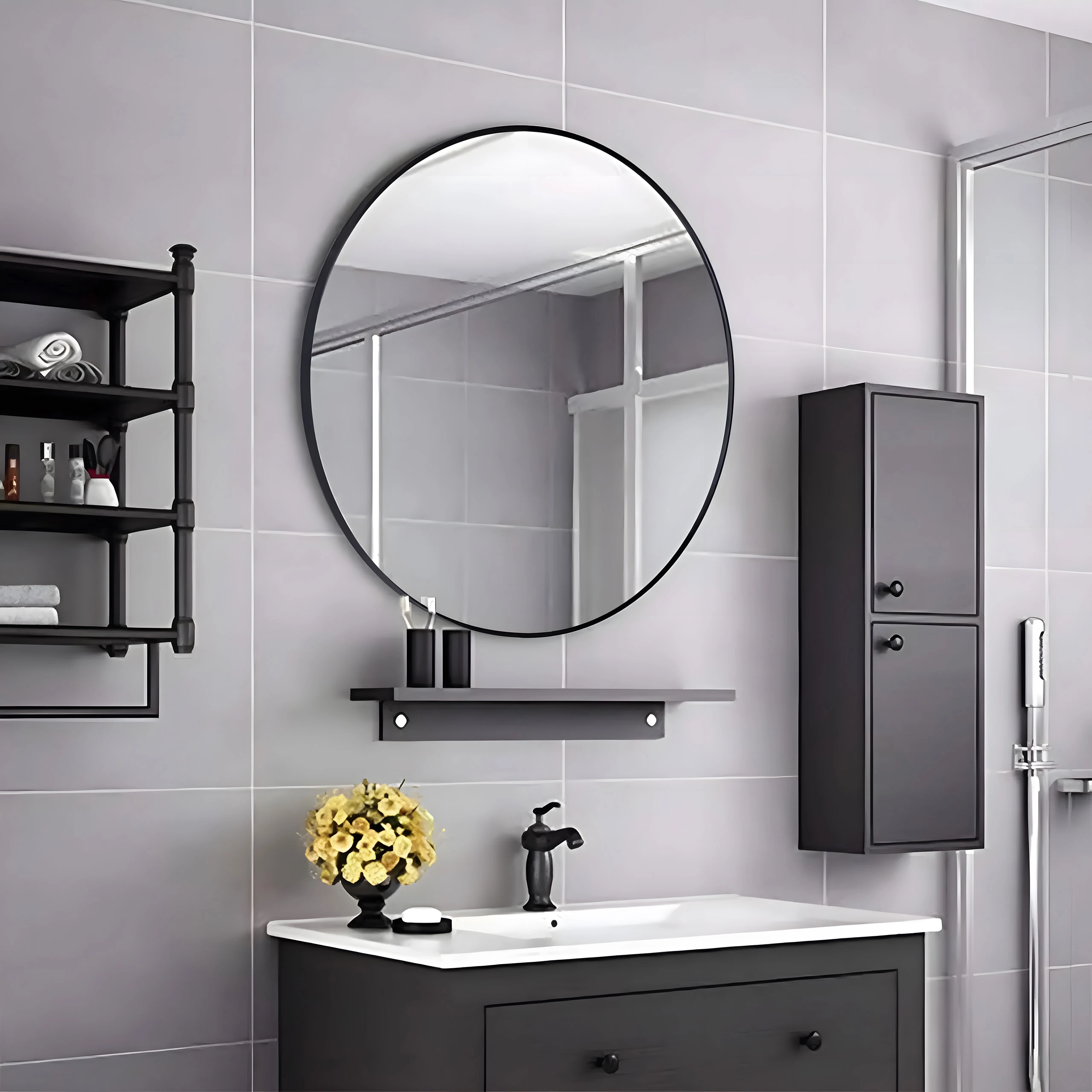 ModernHome wandspiegel is een stijlvol en functioneel accessoire dat perfect past in je badkamer, hal of kleedkamer. De ronde vorm en het moderne design geven je interieur extra elegantie.