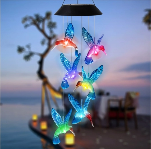 Het zonne-licht met kolibries is een uniek LED-licht dat elke balkon, terras, tuin of kamer een betoverende sfeer geeft. Dankzij zonne-energie gaan deze windgongen automatisch aan bij het invallen van de duisternis en wisselen ze van kleur tussen rood, oranje, blauw, geel en paars, waardoor een magisch lichteffect ontstaat.