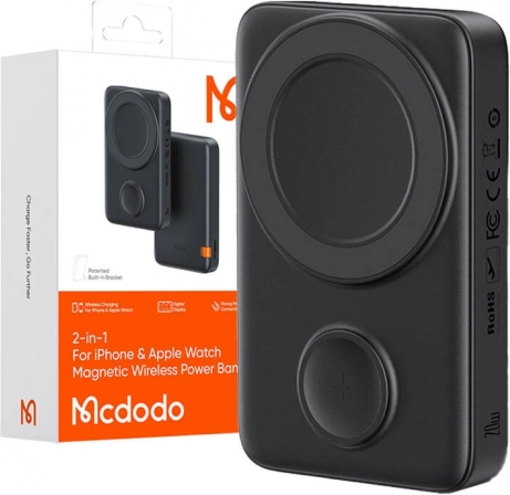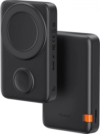 Compacte magnetische powerbank MCDODO 10000 mAh met tot 20 W voor bekabeld laden en 15 W voor draadloos iPhone-laden. Laadt ook Apple Watch (2,5 W) en AirPods, biedt sterke N52-magneten, een verborgen standaard en een LED-display van de laadstatus – ideaal voor onderweg en elke dag.