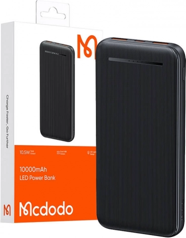 Compacte Mcdodo-powerbank met een capaciteit van 10.000 mAh en twee USB-A-uitgangen laadt twee apparaten tegelijk op. Biedt vermogen tot 10,5 W, overzichtelijke LED-indicatoren van de status en veilig gebruik dankzij geavanceerde beveiligingen tegen overspanning, oververhitting en kortsluiting.