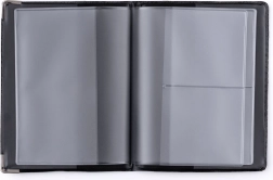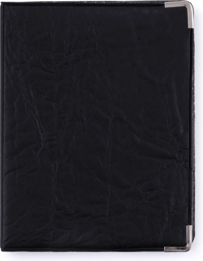 Stijlvolle hoes voor persoonlijke documenten gemaakt van hoogwaardige eco-leer beschermt uw kaarten en visitekaartjes en geeft ze elegantie dankzij decoratieve metalen hoeken.