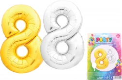 Stijlvolle folieballon in de vorm van het cijfer 8 met een diameter van 40 cm, ideaal voor verjaardagen, jubilea en themafeesten. Verkrijgbaar in de elegante kleuren goud en zilver, gemaakt van duurzaam nylon voor een langere levensduur en mooie glans.