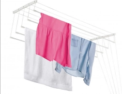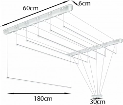Het droogrek wordt aan het plafond gemonteerd, dus het neemt geen vloerruimte in. Afmetingen 180 × 60 × 30 cm bieden een groot droogoppervlak, zelfs in een kleine badkamer of op het balkon.