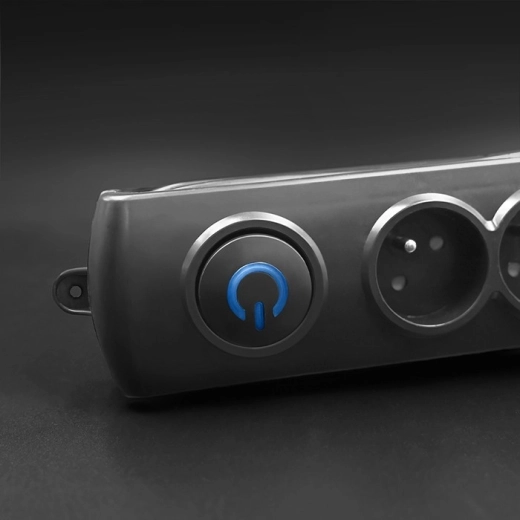 De verlichte schakelaar laat je alle apparaten direct loskoppelen zonder te bukken – ideaal op de vloer bij het bureau of de tv-opstelling.