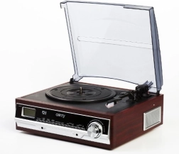 Ontdek de charme van analoog geluid met het gemak van vandaag. Deze retro platenspeler combineert een klassiek houten design met moderne functies: naast het afspelen van vinyl op drie snelheden heeft hij ook een ingebouwde radiotuner en een AUX-ingang. Dankzij de ingebouwde luidsprekers geniet je direct van muziek – zonder extra apparatuur.