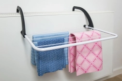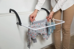 Radiatordroogrek met duurzame armen dat ook aan het balkon kan worden gehangen. Ideaal voor kleine dagelijkse wasjes. Heeft verstelbare en inklapbare armen van kunststof, voorzien van beschermende kappen om oppervlakken tegen krassen te beschermen tijdens gebruik.