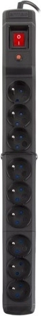 Zwarte overspanningsbeveiligde stekkerdoos Multi M9 met 9 stopcontacten en 1,5 m kabel, voor veilig aansluiten van apparaten thuis en op kantoor.