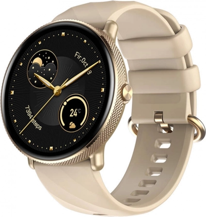 De gouden metalen behuizing en de beige band geven het horloge een moderne look en stijl. Dankzij de touch-interface is navigeren eenvoudig.