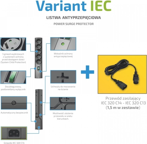 De stekkerdoos heeft vijf geaarde contactdozen met kinderbeveiliging, die voorkomt dat kinderen toegang krijgen tot onder spanning staande delen. Verdere functies zijn een overspanningsindicator (LED), een automatische zekering die snel en eenvoudig herinschakelen mogelijk maakt, en een tweepolige verlichte schakelaar.