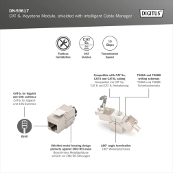 Afgeschermde module Keystone CAT 6A van het merk DIGITUS biedt uitstekende prestaties en netwerkkwaliteit. Het compacte ontwerp maakt de installatie van 24 modules op een 483 mm (19") 1U paneel mogelijk.