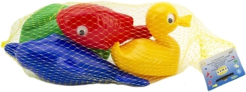 - geel eendje, blauwe dolfijn, groene kikker, rood visje
