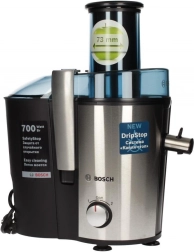Krachtige BOSCH-sapcentrifuge voor snelle, verse sappen van fruit en groenten. Voorzien van een motor van 700 W, een vulopening van 73 mm voor hele stukken, een roestvrijstalen zeef voor fijne sap en schoon werken dankzij DripStop. Twee standen voor zachte en harde ingrediënten (2 snelheden), veilig gebruik met een veiligheidsvergrendeling en eenvoudige reiniging.