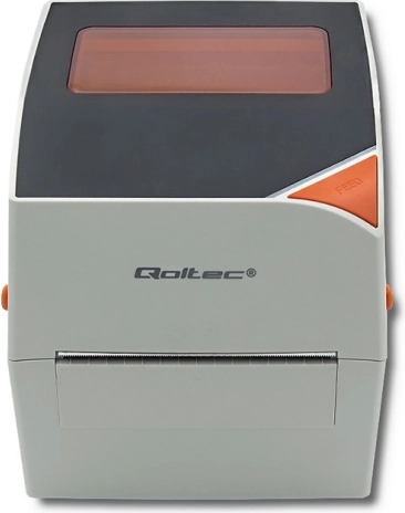 De Qoltec labelprinter met een elegant design en een oranje element rond de knop 'FEED' blinkt uit in functionaliteit bij het printen van etiketten en barcodes.