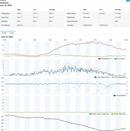 Volg gedetailleerde grafieken van temperatuur-, wind-, neerslag- en luchtdrukverloop. Zo ontdek je eenvoudig trends en plan je activiteiten op basis van de actuele omstandigheden.