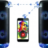 Binnenin bevinden zich 2 × 4" (102 mm) drivers met bassreflex voor krachtigere bassen en heldere hoge tonen binnen 40 Hz – 20 kHz. De ingebouwde Li‑ion batterij van 1200 mAh levert 4–8 uur muziek; opladen gaat gemakkelijk via micro‑USB. De bediening verloopt via multimediaknoppen, een draaiknop en een duidelijk LED-display. De RGB‑verlichting van de luidsprekers en de voet kan worden uitgeschakeld door de M-knop lang ingedrukt te houden.