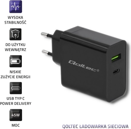 POWER DELIVERY (PD) past spanning en stroom slim aan het aangesloten apparaat aan en levert dankzij de moderne USB‑C-interface hoge efficiëntie en veelzijdigheid. Het vermogen van 45 W is voldoende voor smartphones, tablets en geselecteerde laptops, zodat u één lader voor meerdere apparaten kunt gebruiken.