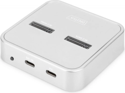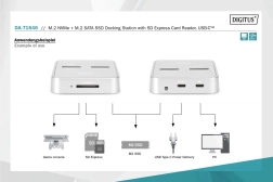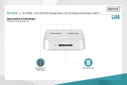 Het universele DIGITUS-dockingstation combineert twee onafhankelijke sleuven voor M.2‑SSD’s – één voor NVMe (B+M Key / M‑Key) en één voor SATA (B+M Key) – plus een SD Express 7.1-kaartlezer. Zo krijgt u een flexibel centrum voor databeheer en -migratie met ondersteuning voor drives tot 4 TB per sleuf en SD‑kaarten tot 2 TB.
