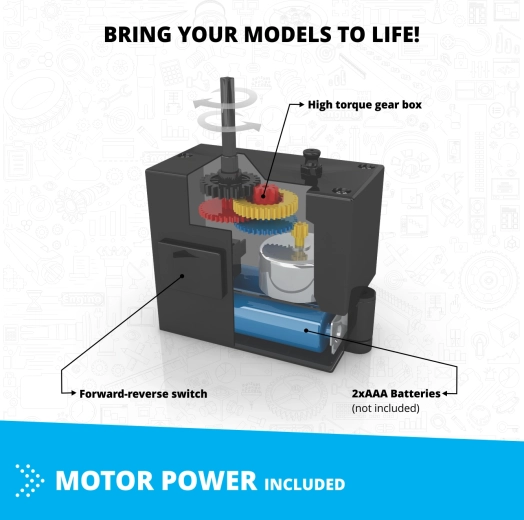 Dankzij de krachtige motor met tandwieloverbrenging en hoog koppel komen je modellen tot leven met realistische beweging. De bouwset ondersteunt STEM-principes (science, technology, engineering, mathematics) en motiveert kinderen om te experimenteren en eigen constructies te maken.