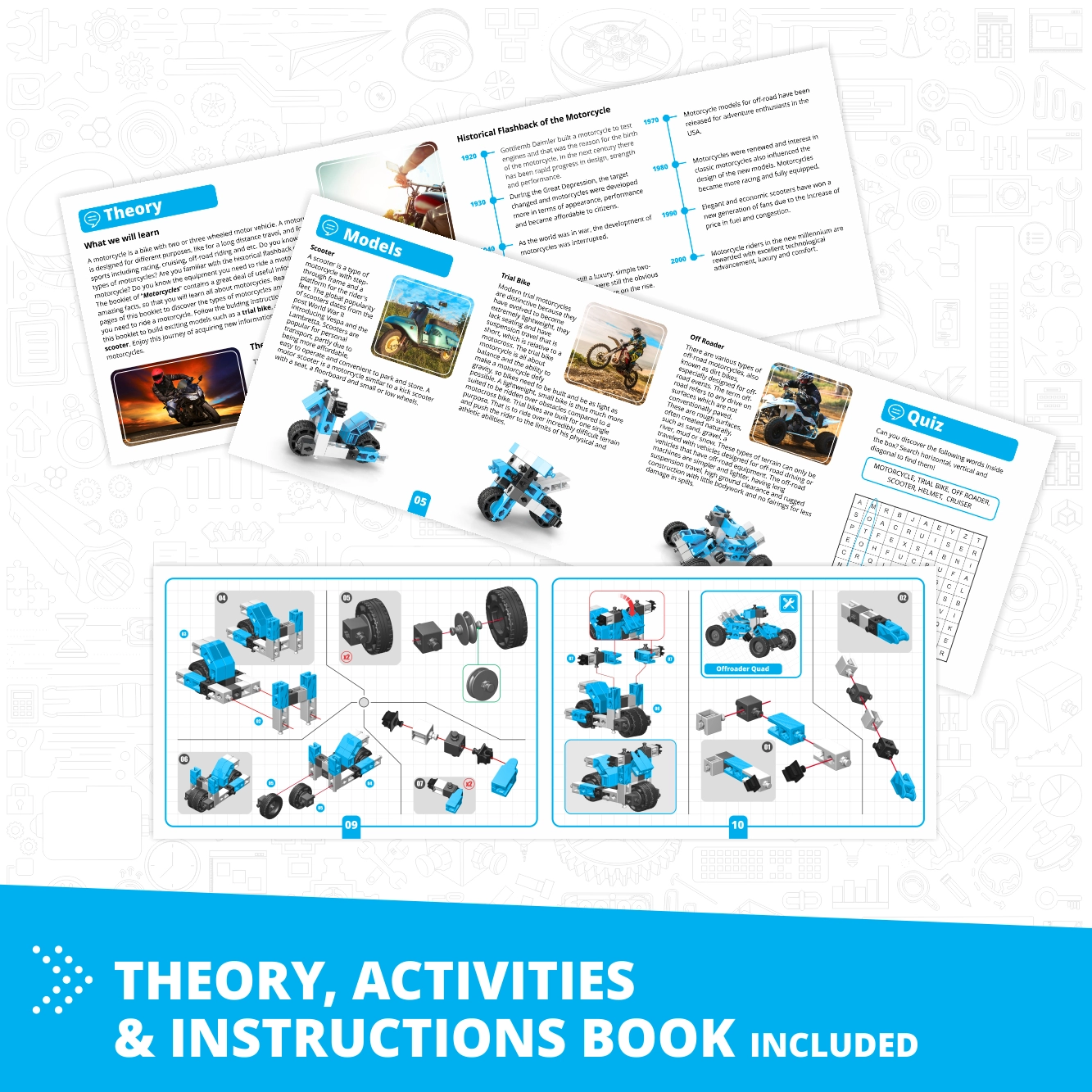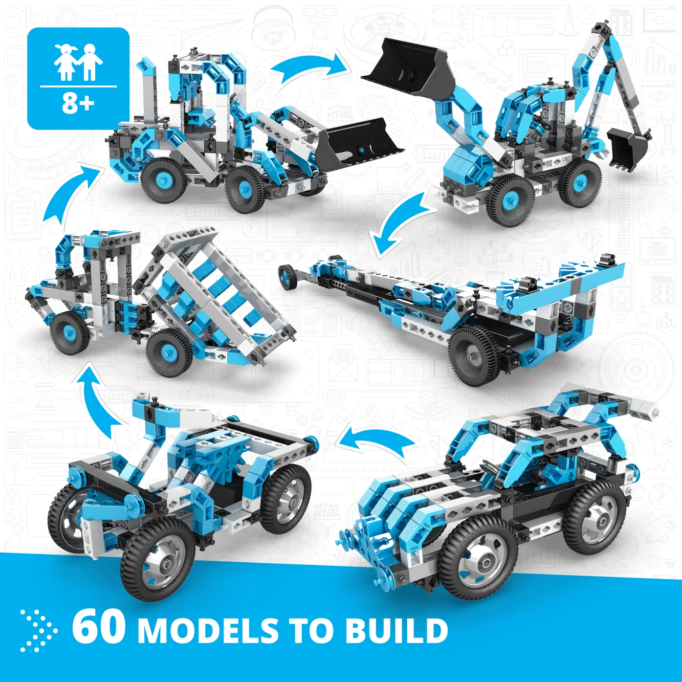 - 60 modellen in één – formulewagen, kiepwagen, graafmachine, quad, ruimteschip, kangoeroe en meer