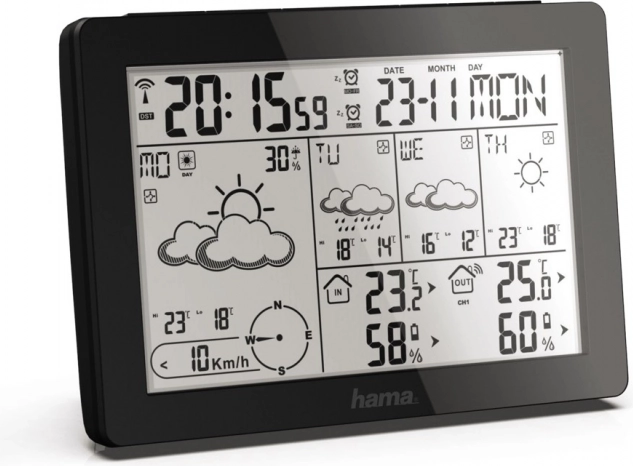 - Digitale weergave van temperatuur, tijd, professionele weersvoorspelling en luchtvochtigheid, kans op neerslag, windsnelheid en -richting