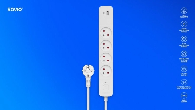Savio LZ-11 stekkerdoos combineert vier geaarde stopcontacten met twee USB-poorten (USB-A en USB-C), ideaal voor het snel opladen van je apparaten. Dankzij Quick Charge 3.0 en Power Delivery 3.0 kun je je mobiele apparaten snel opladen zonder extra laders.