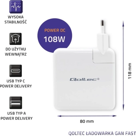 De Qoltec GaN FAST 108W lader vormt een revolutie in oplaadtechnologie dankzij het innovatieve gebruik van het halfgeleidermateriaal GaN. Deze technologie zorgt ervoor dat de lader niet alleen krachtig en snel is, maar ook lichter dan traditionele modellen.