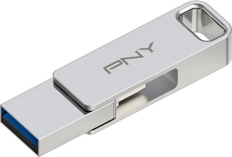 Compacte en duurzame flashdrive PNY Duo Link 256 GB met dubbele connector USB‑C en USB‑A verbindt moderne telefoons, tablets en computers. Biedt leessnelheden tot 200 MB/s, snelle back-ups onderweg en eenvoudig ruimte vrijmaken op je telefoon door foto’s, video’s en documenten over te zetten.
