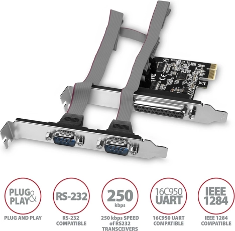 Breid je desktop uit met betrouwbare industriële poorten met de AXAGON PCEA‑PSN kaart. Biedt 1× parallelle LPT (DB25) direct op de kaart en 2× seriële RS232 (DB9) op een aparte slotplaat, hoge compatibiliteit dankzij de ASIX AX99100 chipset, overdracht tot 250 kBd en ondersteuning voor Plug & Play. In de verpakking zitten ook standaard- en low‑profile slotplaten voor verschillende behuizingen.
