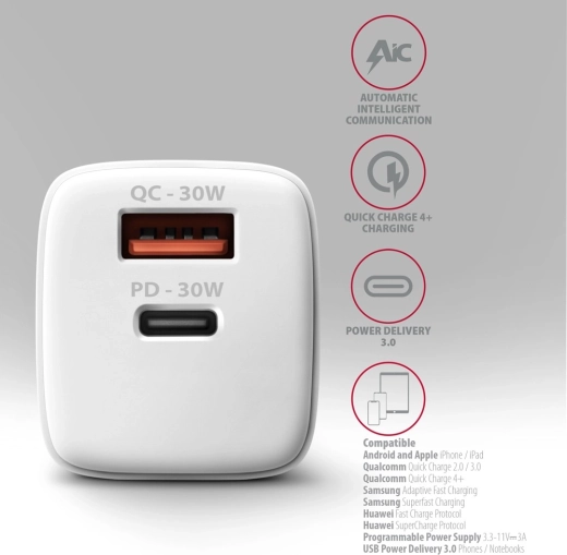 Snelle en veelzijdige lader voor smartphones, tablets en kleinere laptops. De USB‑C PD 3.0 / QC 4+ en USB‑A QC 3.0 uitgangen leveren tot 30 W bij afzonderlijk laden en slimme vermogensverdeling bij het gelijktijdig laden van twee apparaten. Ondersteuning voor PPS zorgt voor optimale spanning en stroom voor moderne smartphones.