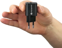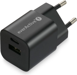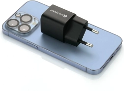 Compacte netlader van everActive met GaN-technologie en twee uitgangen – USB-A met QC 3.0 en USB‑C met Power Delivery PPS 30 W. Dankzij de efficiënte GaN‑chip is hij kleiner, lichter en koeler, terwijl hij snel en veilig opladen biedt voor telefoons, tablets en andere apparaten.
