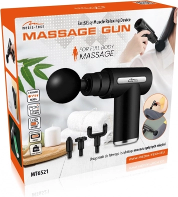 - 4 verwisselbare opzetstukken: veerkrachtige bal (grotere spiergroepen), punt/naald (intensief triggerpointwerk), dubbele punt/vork (gebied langs de wervelkolom, kuiten), vlakke kop (universeel voor kleine en grote spieren)