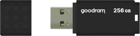 GOODRAM UME3 256 GB – snelle USB 3.0‑flashdrive in het zwart. Lezen tot 60 MB/s, schrijven tot 20 MB/s, praktische dop en levenslange garantie.