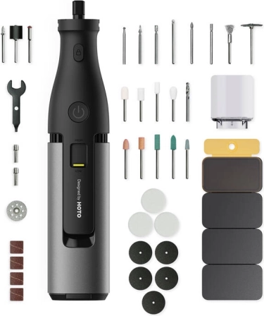 Rijke uitrusting in de 36‑delige set omvat diverse bits, schijfjes en opzetstukken voor zowel fijn afwerken als krachtiger materiaalafname. Zo voert u eenvoudig kleine reparaties uit, werkt u randen bij, maakt u oppervlakken glad of boort u kleine gaten.
