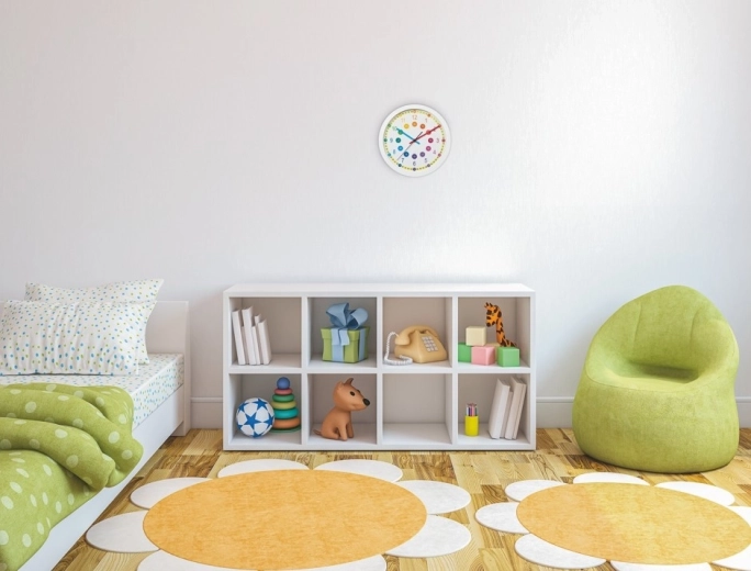Dankzij het stille quartzmechanisme met een vloeiende secondewijzer tikt de klok niet en is hij ook geschikt voor de slaapkamer. Het strakke ontwerp met witte rand past in elke kinderkamer en oogt speels en motiverend.