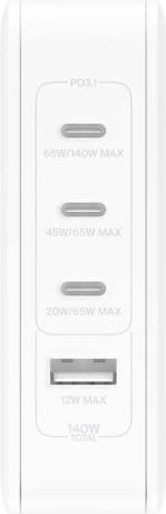 Geniet van snel opladen met een 4-poorts oplader die een krachtig vermogen tot 140 W levert, zodat je een laptop en drie extra apparaten tegelijk kunt opladen.