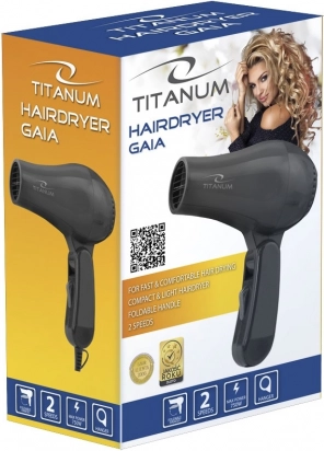De reisföhn TITANUM GAIA is licht en past dankzij de inklapbare handgreep gemakkelijk in elke tas. De zwarte uitvoering en de duurzame hoogwaardige kunststof behuizing zorgen voor een lange levensduur en comfortabel gebruik in de badkamer en op reis.