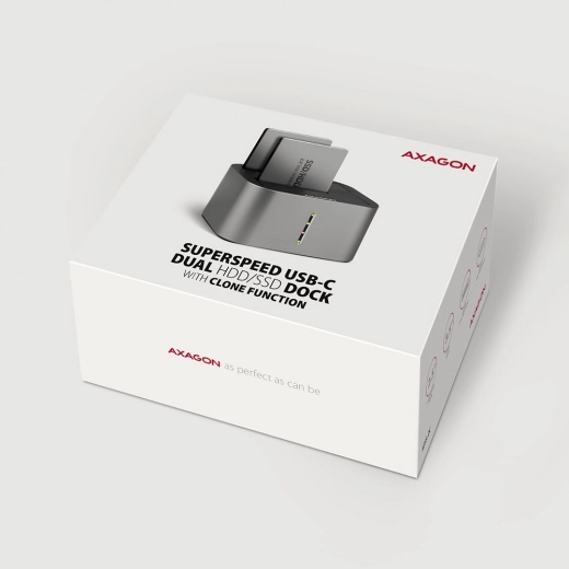 AXAGON‑dockingstation voor 2× SATA 2.5"/3.5" met USB‑C 5 Gb/s, UASP, TRIM en offline klonen. Snelle aansluiting, LED‑indicatie, stabiele aluminium behuizing.
