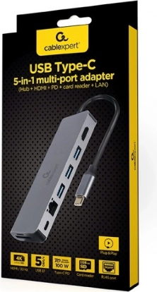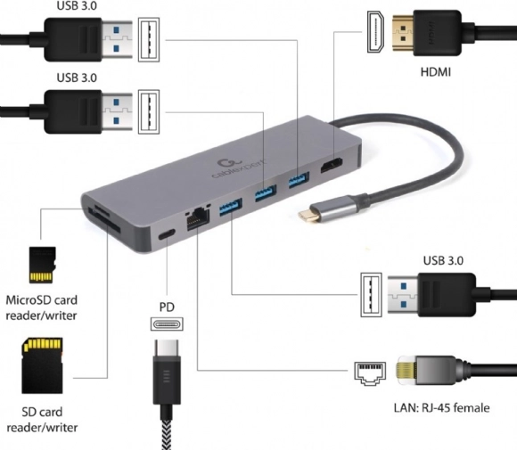 Compacte hub voor laptops en tablets met usb‑c voegt alles toe wat je nodig hebt: hdmi met uhd 4k, gigabit‑ethernet, 2× usb‑a (usb 3.1 5 Gb/s), sd/microsd‑kaartlezer en usb‑c power delivery 100 W in een robuuste metalen behuizing.