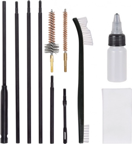 De set bestaat uit een 6-delige, geschroefde trekstang met een maximale lengte van 83 cm, gemaakt van gezwart staal voor een lange levensduur en slijtvastheid. De set bevat messing borstels voor het reinigen van de loop en de kamer, die vervuiling effectief verwijderen zonder het oppervlak van stalen onderdelen te beschadigen. Ook inbegrepen is een kunststof borstel met verschillende borstelhardheden, ideaal voor het reinigen van moeilijk bereikbare plaatsen, zoals de afsluiter-/sluitkamerruimtes. Het T-vormige, draaiende handvat vergemakkelijkt het manoeuvreren met de trekstang en zorgt voor een nauwkeurige reiniging van de loop. Verder bevat de set een punt voor het aanbrengen en afvegen van patches en een handborstel van nylon met twee uiteinden, ideaal voor het onderhoud van delicate wapenonderdelen.