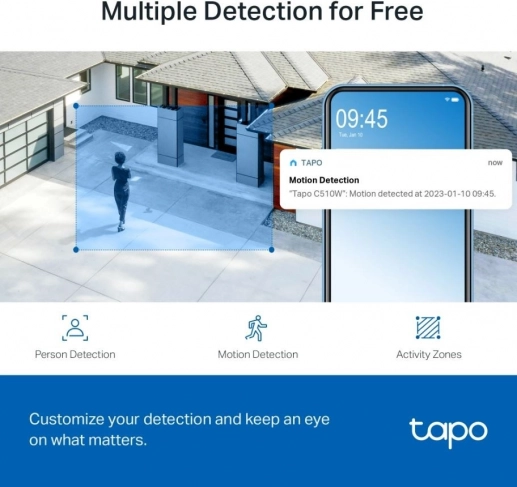 Geavanceerde AI-detectie herkent personen en laat je activiteitszones en virtuele grenzen instellen voor nauwkeurige meldingen. De functie Smart Tracking volgt automatisch beweging, terwijl het licht- en geluidsalarm ongenode gasten afschrikt – inclusief de mogelijkheid om je eigen geluid op te nemen. Opnames kunnen worden opgeslagen op een microSD-kaart (tot 512 GB) of in de Tapo Care-cloud. De IP65-bescherming garandeert betrouwbaar gebruik buitenshuis, het hele jaar door.