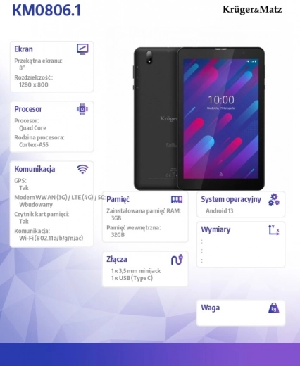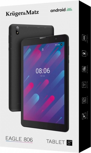 Tablet Kruger&Matz Eagle biedt een compact ontwerp met een 8-inch IPS-scherm dat scherp en helder beeld verschaft. Dankzij de quad-core processor en 3 GB RAM garandeert het een soepele werking zelfs bij zwaardere taken. De interne opslagcapaciteit van 32 GB is uitbreidbaar met een microSD-kaart.