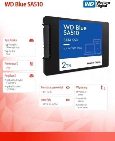WD Blue SA510 is een moderne SATA-SSD, ontworpen voor creators, professionals en veeleisende gebruikers die de opstart van het systeem, projectwerk en dagelijkse productiviteit willen versnellen. Dankzij leessnelheden tot 560 MB/s en lage latentie versnelt hij merkbaar het laden van apps en het werken met grote bestanden. Het lage energieverbruik verlengt de batterijduur van je laptop en de werking zonder mechanische onderdelen elimineert trillingen en vermindert het risico op gegevensverlies bij vallen.