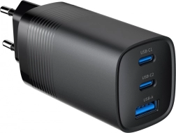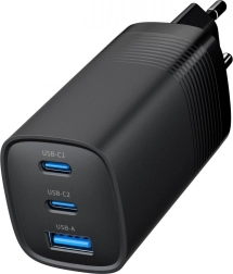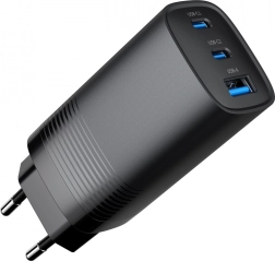 De oplader met drie poorten biedt een hoog vermogen van 65 W, voldoende voor snel opladen van zowel smartphones als laptops. Hij maakt gebruik van GaN-technologie, wat een compact en draagbaar apparaat mogelijk maakt dat bovendien energiezuinig is.
