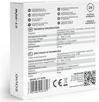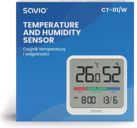 De SAVIO CT-01 is een veelzijdige kamerthermometer en hygrometer die de actuele temperatuur (°C/°F), relatieve luchtvochtigheid en comfortzone weergeeft voor een snelle evaluatie van het binnenklimaat. Het grote, goed leesbare LCD-scherm wordt aangevuld met tijd en datum, zodat u alle belangrijke informatie op één plek heeft.