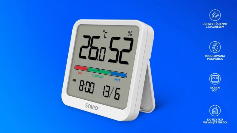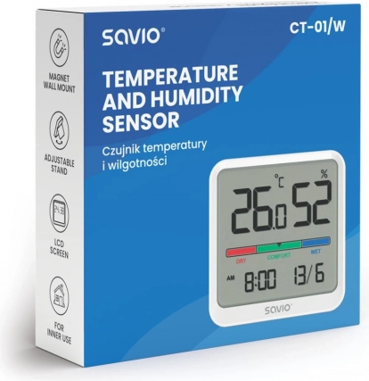 De praktische binnen-thermometer en hygrometer SAVIO CT-01 met een overzichtelijk LCD-scherm houdt betrouwbaar de temperatuur en luchtvochtigheid bij, toont de tijd en datum en helpt dankzij de comfortzone-indicator het ideale klimaat thuis en op kantoor te behouden. De elegante, compacte uitvoering met een magnetische houder en verstelbare standaard maakt eenvoudige plaatsing overal mogelijk.