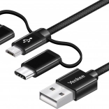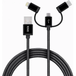 De kabel is uitgerust met drie connectoren – USB‑C, Micro‑USB en Lightning – en biedt daardoor compatibiliteit met diverse apparaten.