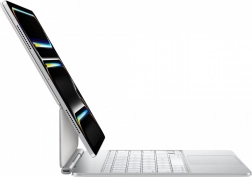 De elegante Magic Keyboard voor de iPad Pro 13" (M4) combineert een toetsenbord en een vloeiende haptische trackpad in een dun, draagbaar design met een aluminium handpalmsteun. Biedt een rij van 14 functietoetsen voor snelle bediening van helderheid en volume, USB‑C voor opladen en een verstelbare standaard voor de ideale kijkhoek. De duurzame constructie beschermt de iPad aan beide zijden bij dagelijks meenemen.