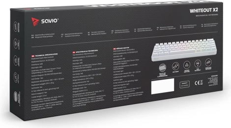 Compact 60% mechanisch toetsenbord SAVIO Whiteout X2 met bruine OUTEMU Brown-schakelaars biedt hot‑swap voor eenvoudig wisselen van switches, volledige N‑key rollover en anti‑ghosting voor foutloze toetsaanslagregistratie en RGB‑verlichting voor een persoonlijke uitstraling. Ideaal voor gaming en productiviteit op een minimalistisch bureau.